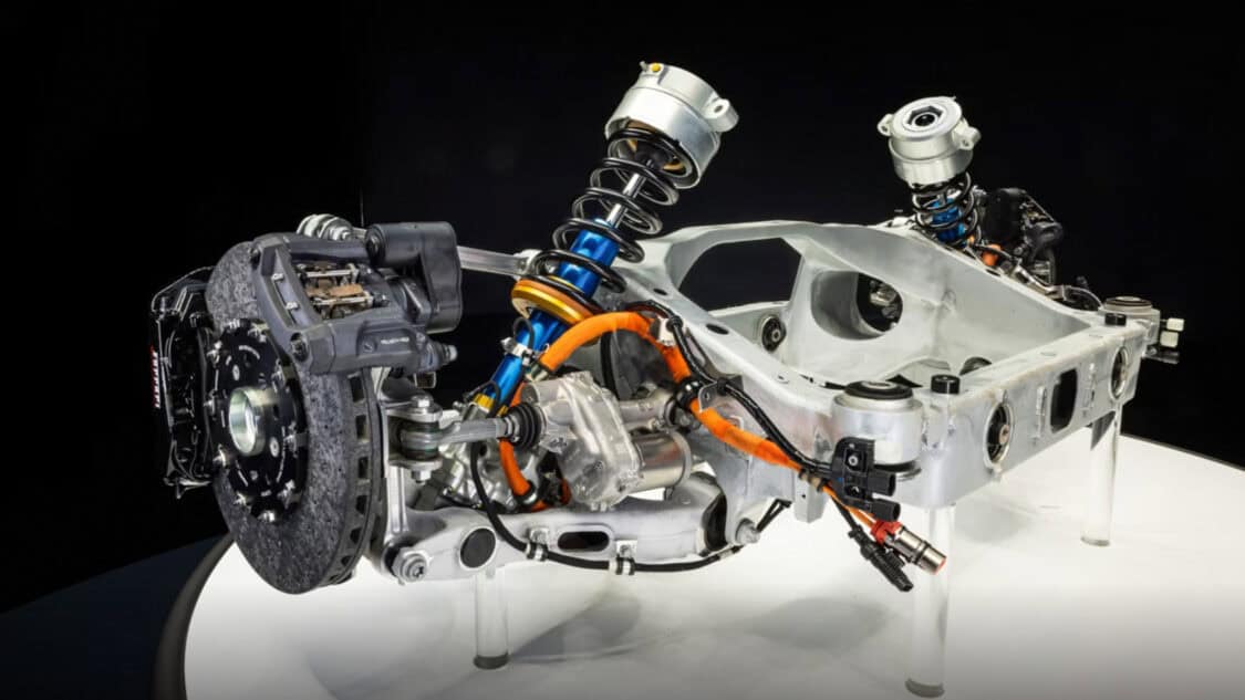 So what makes it feel like a Ferrari? Two e-axles, front and rear, each with twin synchronous permanent magnet motors. They enable torque vectoring, plus the choice of all-wheel drive or rear drive depending on the setting. Peak efficiency reaches 93 percent alongside serious power density. The front inverter sits inside the axle housing and weighs only 9 kg. The rear axle can produce 8,000 Nm at the wheels in Performance Launch mode.